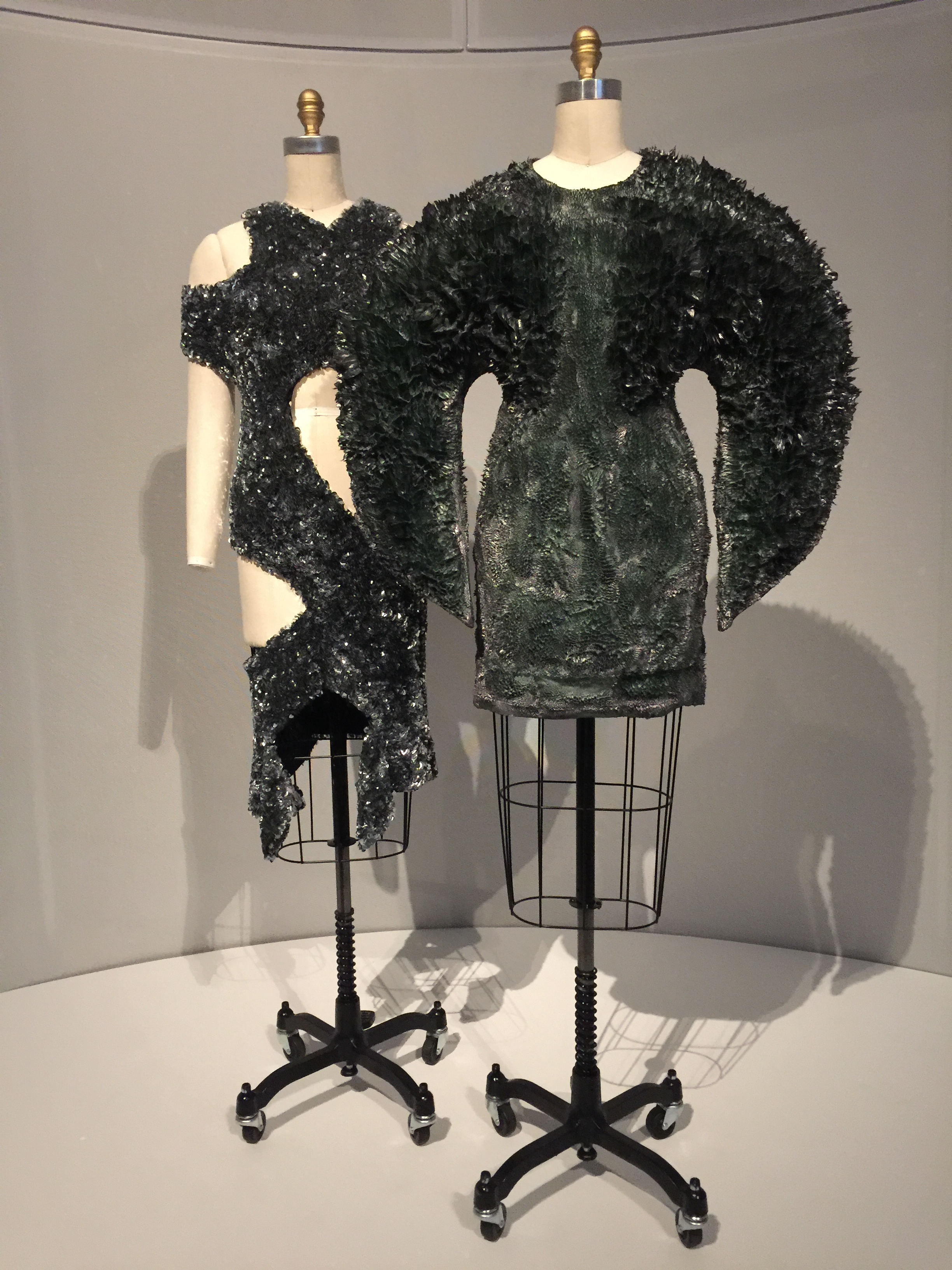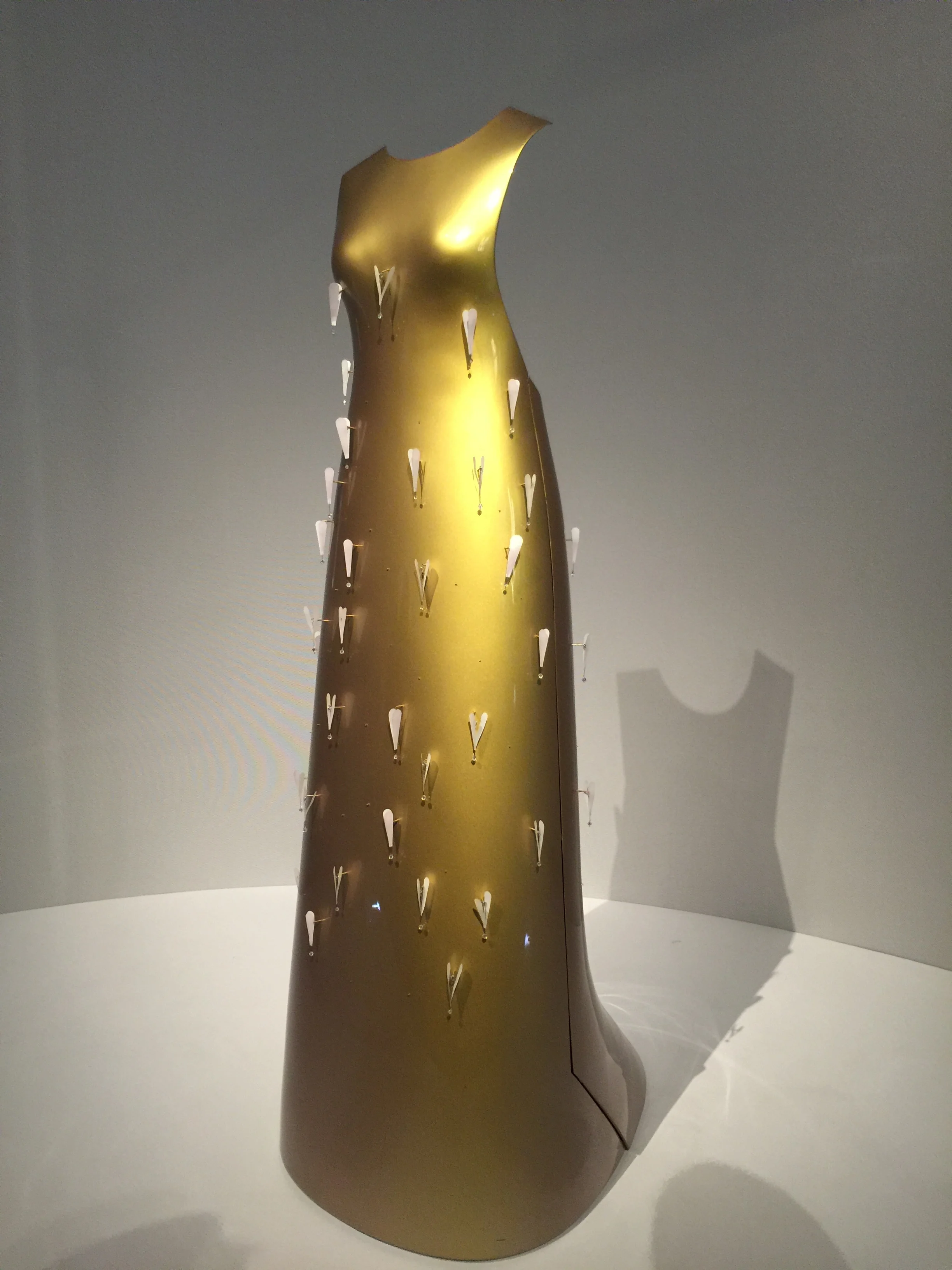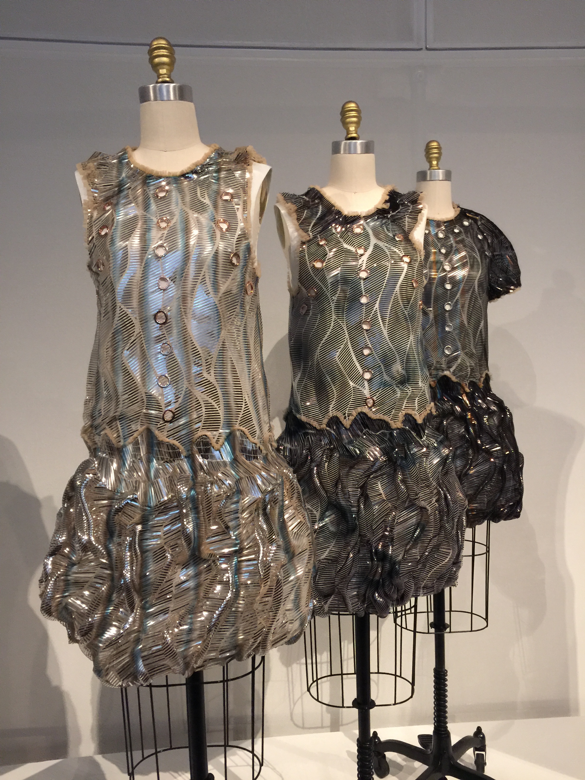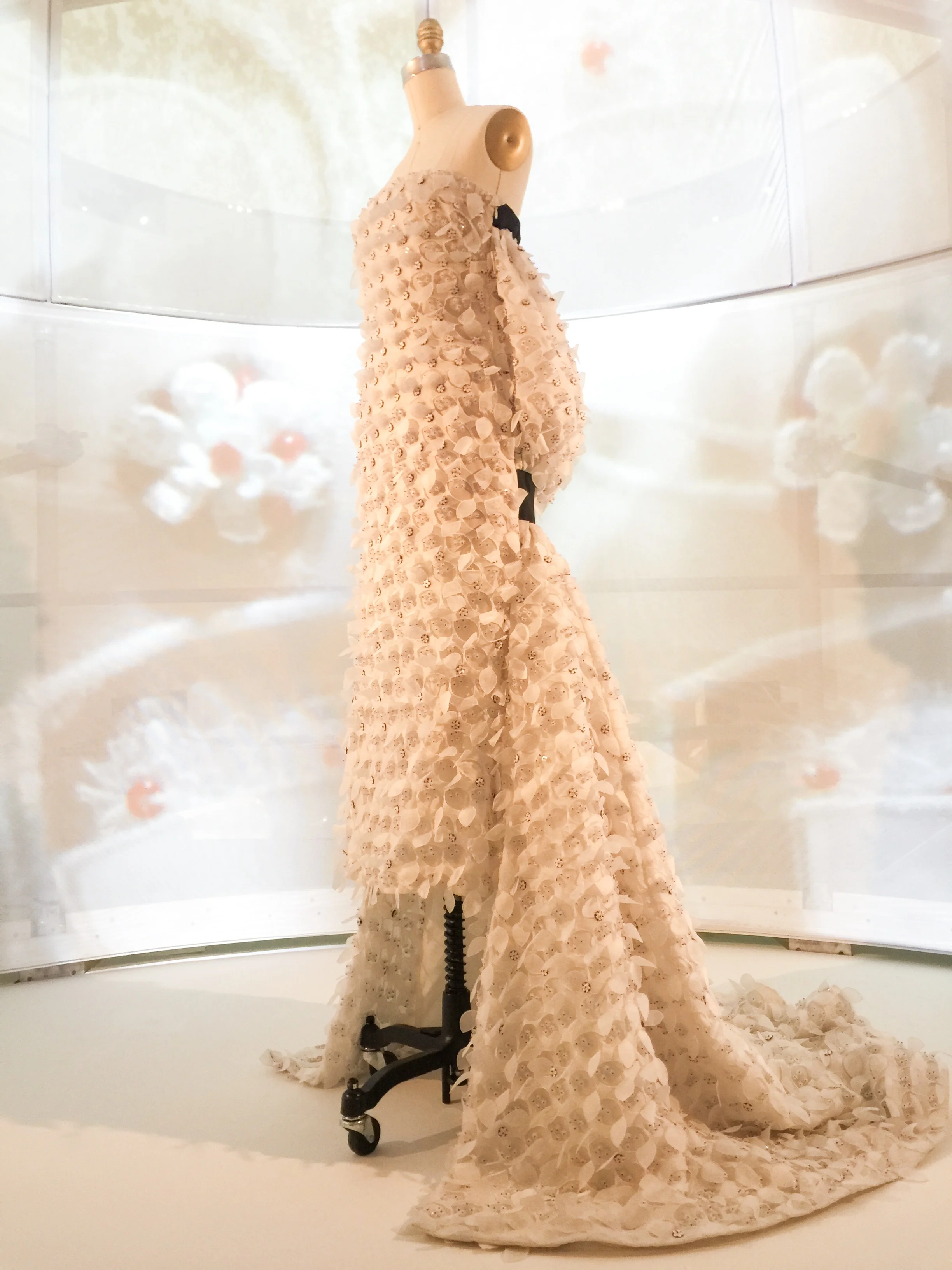 Enter the newest exhibit for the MET talking about fashion in the age of technology organized by the Costume Institute in the Robert Lehman wing. Upon entry you will find yourself being lulled by hauntingly beautiful music along with the sight of a shimmering 20 foot embellished train. Undeniably the most photographed piece, front and center, is the Chanel Wedding ensemble with the train designed by Karl Lagerfeld in 2014, which took over 450 hours of workmanship to complete . Surrounding this is a circular hallway of over a dozen designer pieces that exemplify craftsmanship such as artificial flowers, embroideries and featherwork. Hauntingly beautiful music playing in the background Moving downstairs you will find work that embrace lacework, leatherwork, 4D printing and pleating.