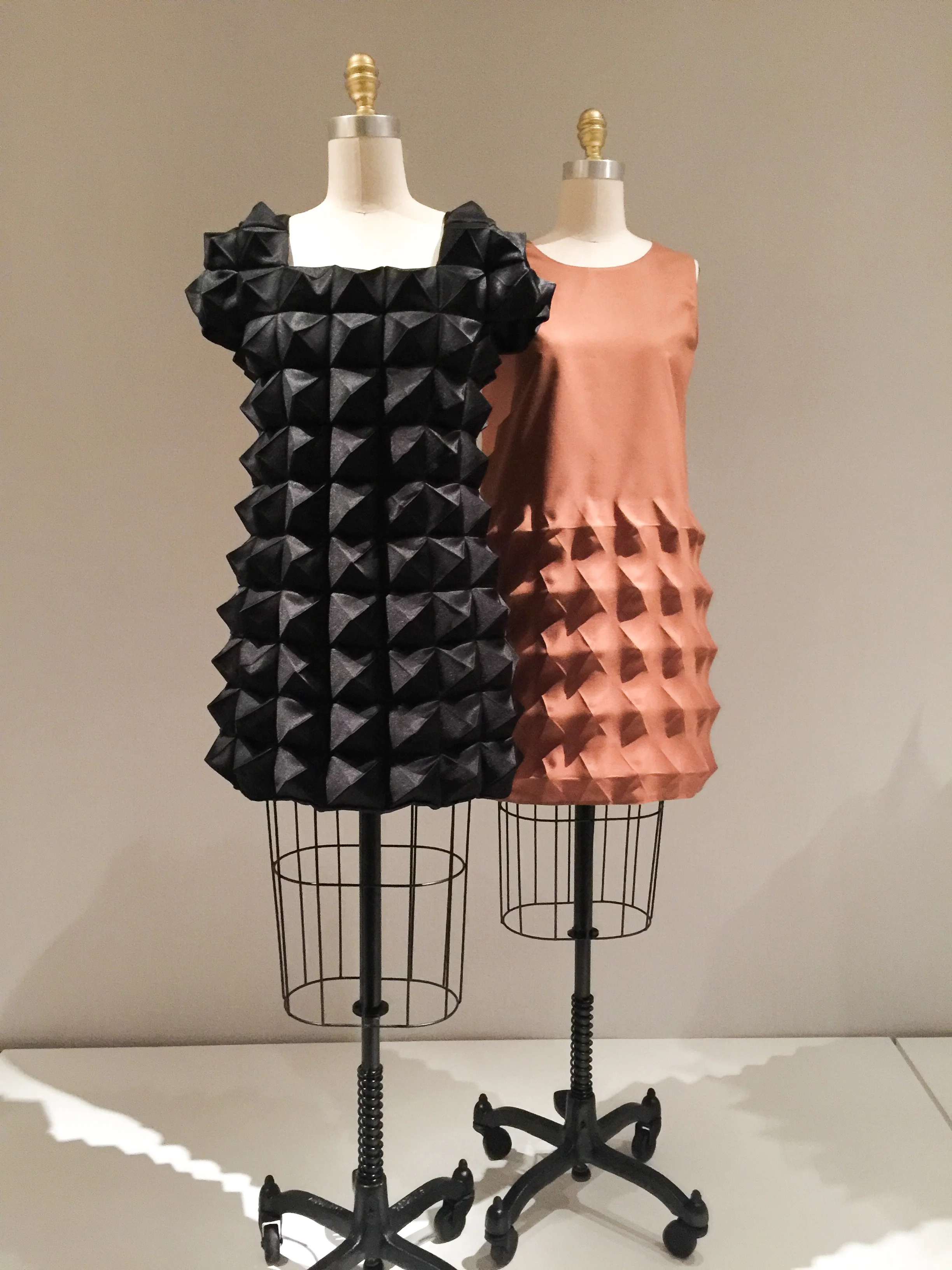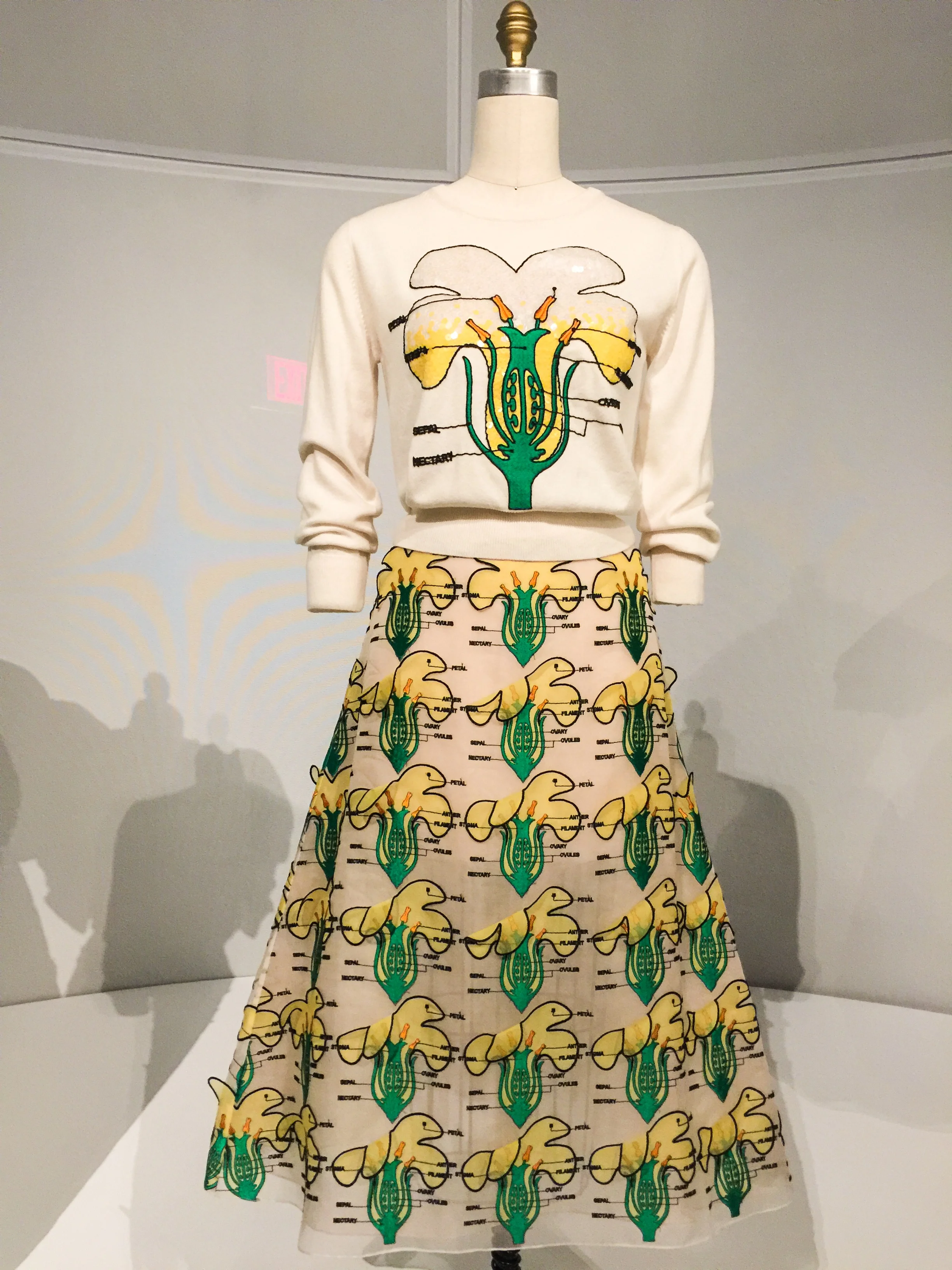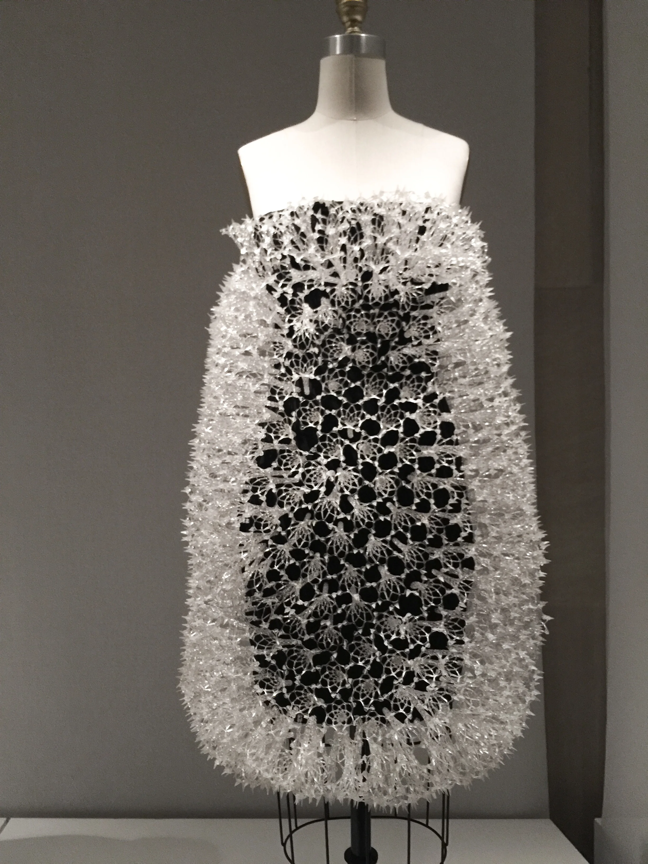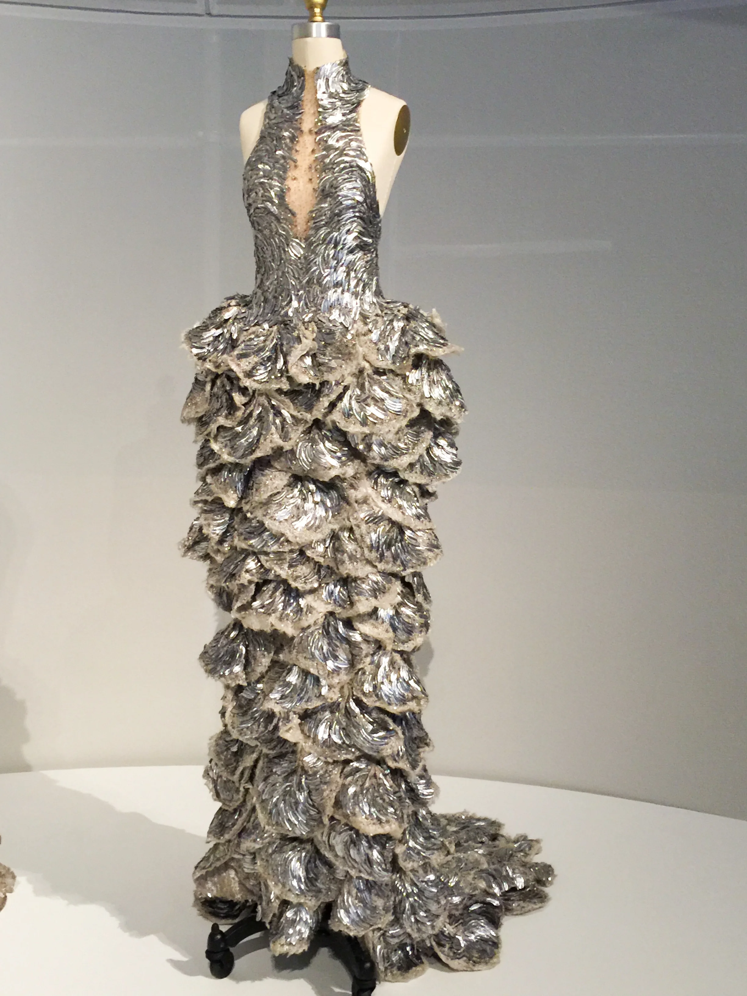 Enter the newest exhibit for the MET talking about fashion in the age of technology organized by the Costume Institute in the Robert Lehman wing. Upon entry you will find yourself being lulled by hauntingly beautiful music along with the sight of a shimmering 20 foot embellished train. Undeniably the most photographed piece, front and center, is the Chanel Wedding ensemble with the train designed by Karl Lagerfeld in 2014, which took over 450 hours of workmanship to complete . Surrounding this is a circular hallway of over a dozen designer pieces that exemplify craftsmanship such as artificial flowers, embroideries and featherwork. Hauntingly beautiful music playing in the background Moving downstairs you will find work that embrace lacework, leatherwork, 4D printing and pleating.